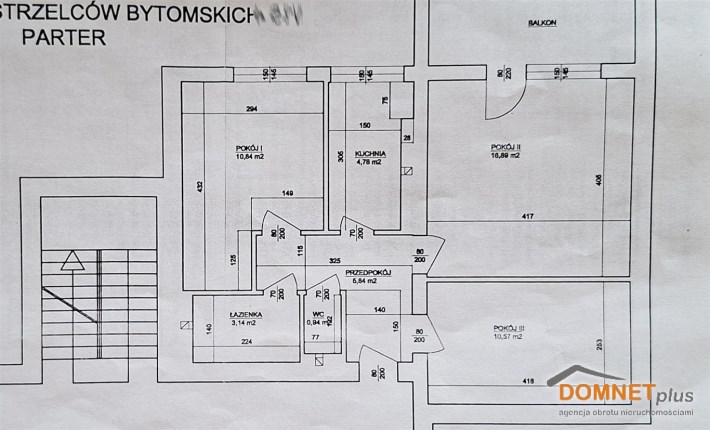 Oferujemy mieszkanie o powierzchni 53m2 zlokalizowane w Bytomiu Śródmieściu przy ulicy Strzelców Bytomskich. Usytuowane na wysokim parterze w 4 piętrowym budynku (po termoizoloacji). Składa się z 3 niezależnych pokoi (10,84m2; 16,89m2 i 10,57m2), widnej kuchni (4,78m2), łazienki (3,14m2), oddzielnej toalety (0,94m2) i przedpokoju (5,84m2) oraz bardzo dużego balkonu. Umeblowanie i wyposażenie widoczne na zdjęciach pozostaje. Mieszkanie po generalnym remoncie 11 lat temu. Mieszkanie wystarczy odmalować i zamieszkać. W trakcie remontu wymieniono tynki, wylano na nowo podłogę, wymieniono instalację elektryczną (miedź), instalację wod. - kan. i gazową, wymieniono wszystkie drzwi wewnętrzne i zewnętrzne. Okna plastikowe. Centralne ogrzewanie z sieci miejskiej. Ciepła woda z piecyka gazowego. Do mieszkania przynależy piwnica (4,44m2). Czynsz miesięczny 672,-zł. Mieszkanie zorientowane na dwie strony świata. Wejście do zadbanej klatki schodowej zamykanej na domofon.Do centrum miasta np. CH Agora 20 minut pieszo (1.300m). Bardzo dobra komunikacja z centrum miasta (w pobliżu przystanki autobusowe 100m i tramwajowe 200m) oraz z drogami wylotowymi z miasta w kierunku autostrady A1 Gliwice -Pyrzowice czy w kierunku Piekar Śląskich, Tarnowskich Gór, Zabrza, Świętochłowic.